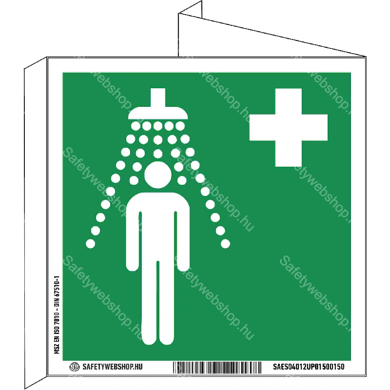 Biztonsági zuhany utánvilágító tábla, faltól elálló, sátor alakú, kétoldalas (ISO 7010-E012 piktogram)