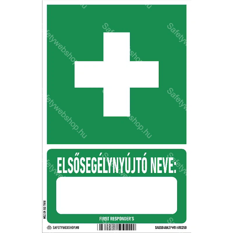 Kezdőlap » Elsősegélyhely elsősegélynyújtó nevével matrica / tábla (ISO 7010-E003 piktogram + felirat)