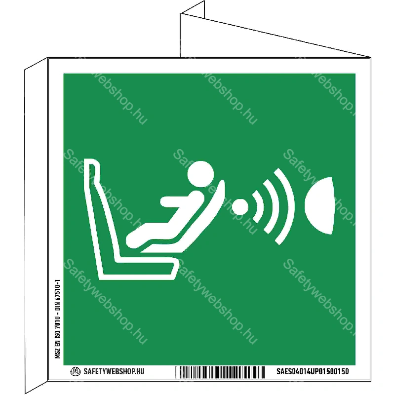 Gyerekülés jelzőrendszerrel (CPOD) felszerelve utánvilágító tábla, faltól elálló, sátor alakú, kétoldalas (ISO 7010-E014 piktogram)