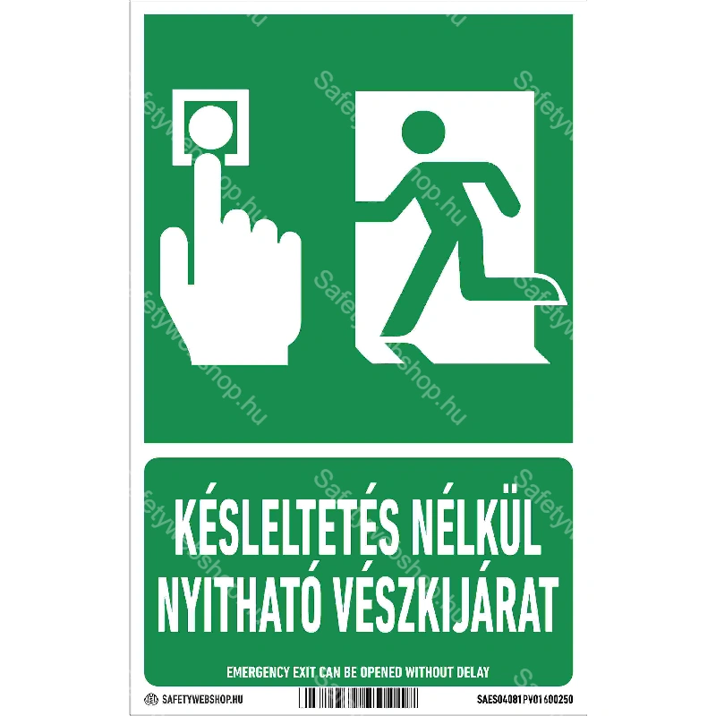 Késleltetés nélkül nyitható vészkijárat matrica / tábla (piktogram + felirat)