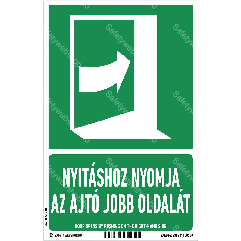 Nyitáshoz nyomja meg az ajtó jobb oldalát! matrica / tábla (ISO 7010-E023 piktogram + felirat)