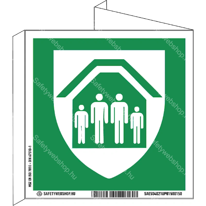 Kezdőlap » Védett hely utánvilágító tábla, faltól elálló, sátor alakú, kétoldalas (ISO 7010-E021 piktogram)