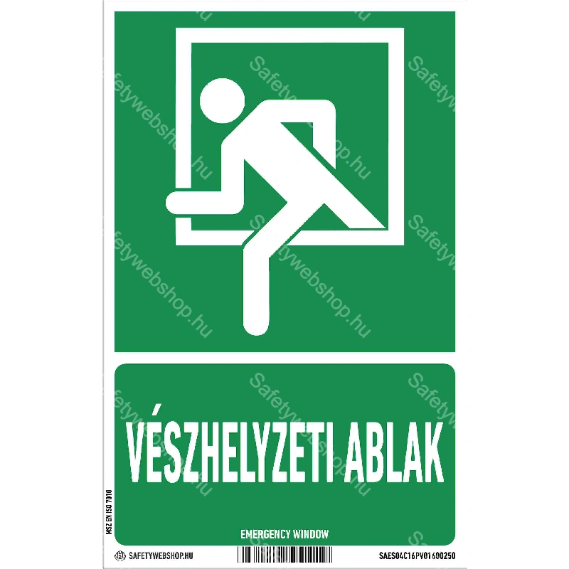 Vészhelyzeti ablak matrica / tábla (ISO 7010-E016C piktogram + felirat)
