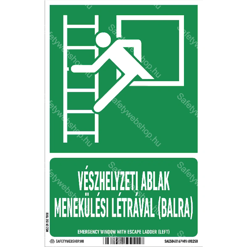 Vészhelyzeti ablak menekülési létrával (balra) matrica / tábla (ISO 7010-E016 piktogram + felirat)