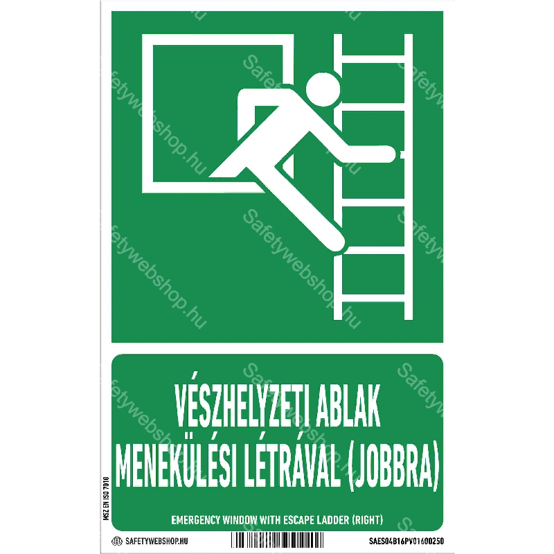 Vészhelyzeti ablak menekülési létrával (jobbra) matrica / tábla (ISO 7010-E016B piktogram + felirat)