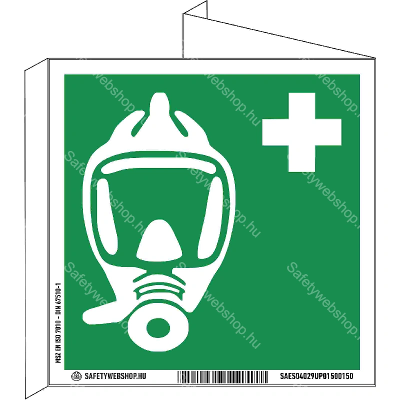 Vészhelyzeti menekülési légzőkészülék utánvilágító tábla, faltól elálló, sátor alakú, kétoldalas (ISO 7010-E029 piktogram)