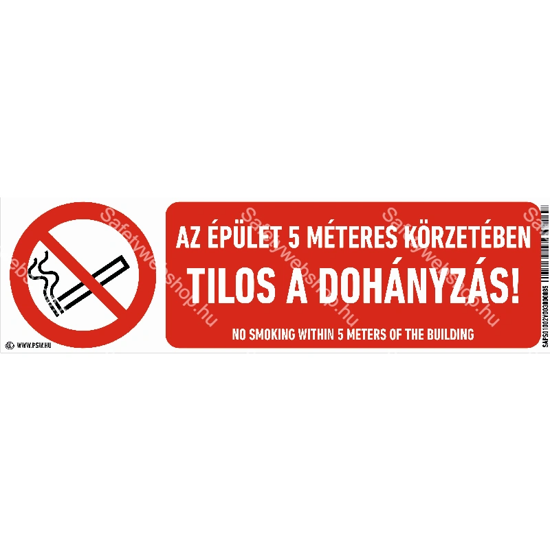 Az épület 5 m-es körzetében tilos a dohányzás! matrica / tábla (ISO 7010-P002 piktogram + felirat)
