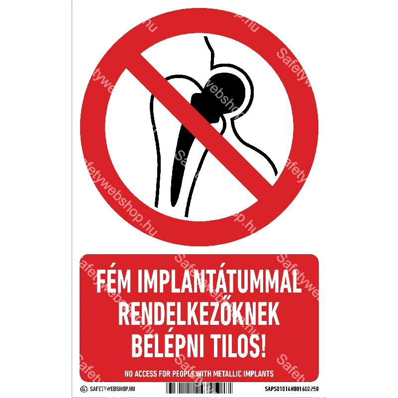 Fém implantátummal rendelkezőknek belépni tilos! matrica / tábla (ISO 7010-P014 piktogram + felirat)