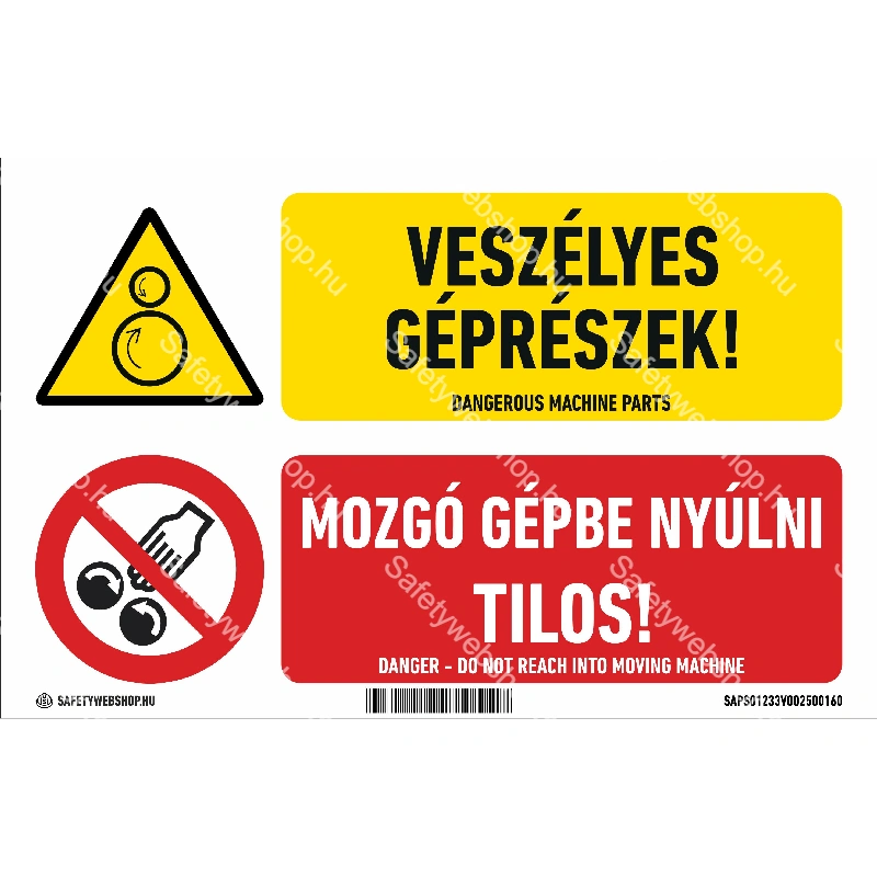 Kezdőlap » Veszélyes géprészek! Mozgó gépbe nyúlni tilos! matrica / tábla (piktogram + felirat)