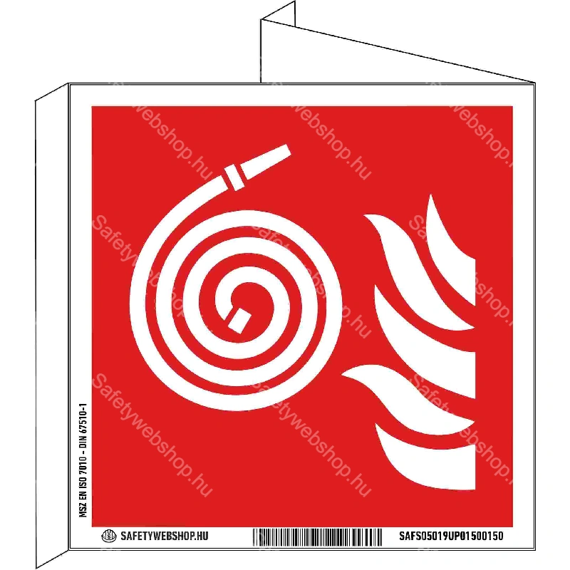 Nem csatlakoztatott tűzoltó tömlő utánvilágító tábla, faltól elálló, sátor alakú, kétoldalas (ISO 7010-F019 piktogram)