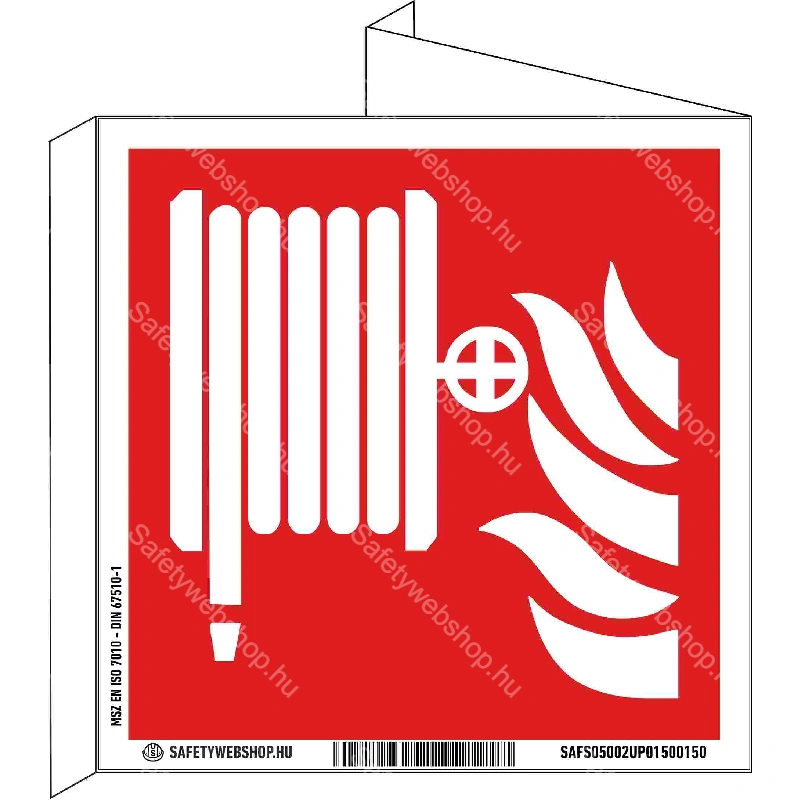 Tűzivíz tömlő utánvilágító tábla, faltól elálló, sátor alakú, kétoldalas (ISO 7010-F002 piktogram)