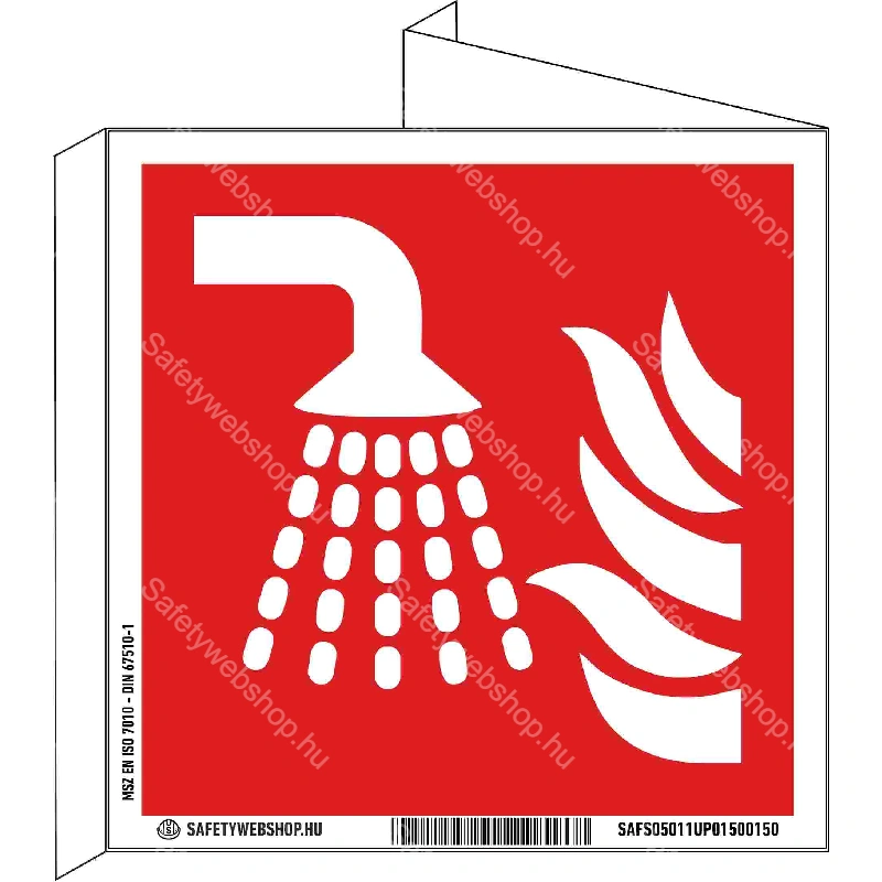 Vízköddel oltó egység utánvilágító tábla, faltól elálló, sátor alakú, kétoldalas (ISO 7010-F011 piktogram)